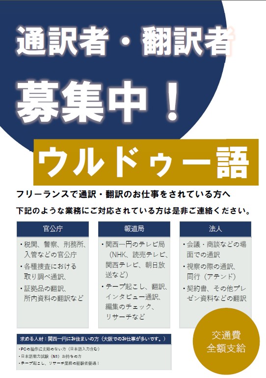 ウルドゥー語通訳者を募集中! 関西、特に大阪にお住まいの通訳者・翻訳者の方は是非ご連絡ください!